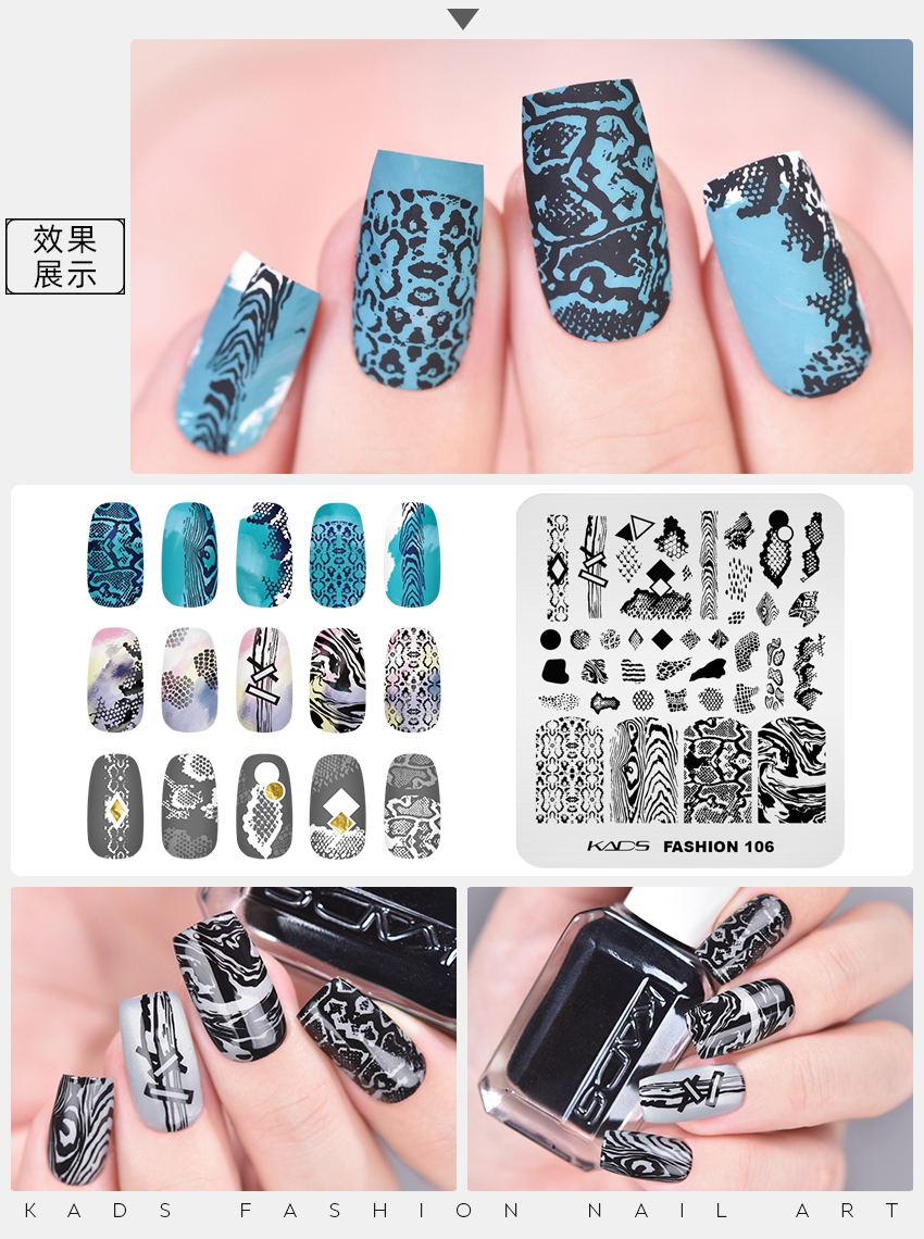 Fashion 106 Nail Stamping Plate ゼブラストライプ、ヘビ柄、幾何学模様、大理石の渦巻き模様
